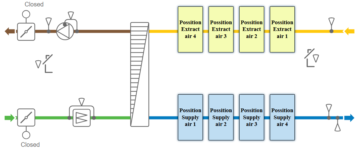 Version 5.4 and later of Access introduce a more flexible component representation within the flowchart. There are four available positions for adding components to the supply-air path and four positions for the extract-air path. This means that elements such as heaters, coolers, and humidifiers are no longer restricted to predefined locations; they can be assigned to any available position to reflect the actual physical installation.